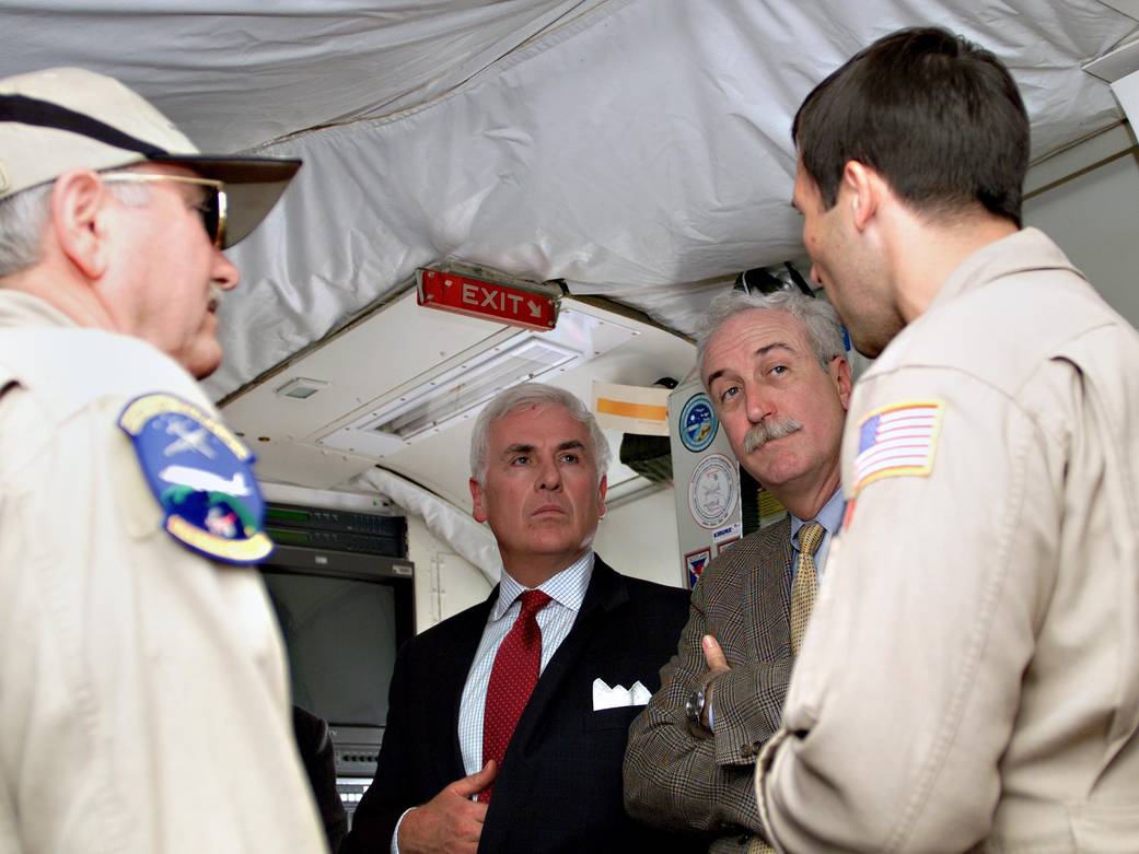 Tom Mace and Walter Klein(far right) brief John Danilovich, US Ambassador to Costa Rica, and NASA Administrator Sean O'Keefe onboard NASA's DC-8.