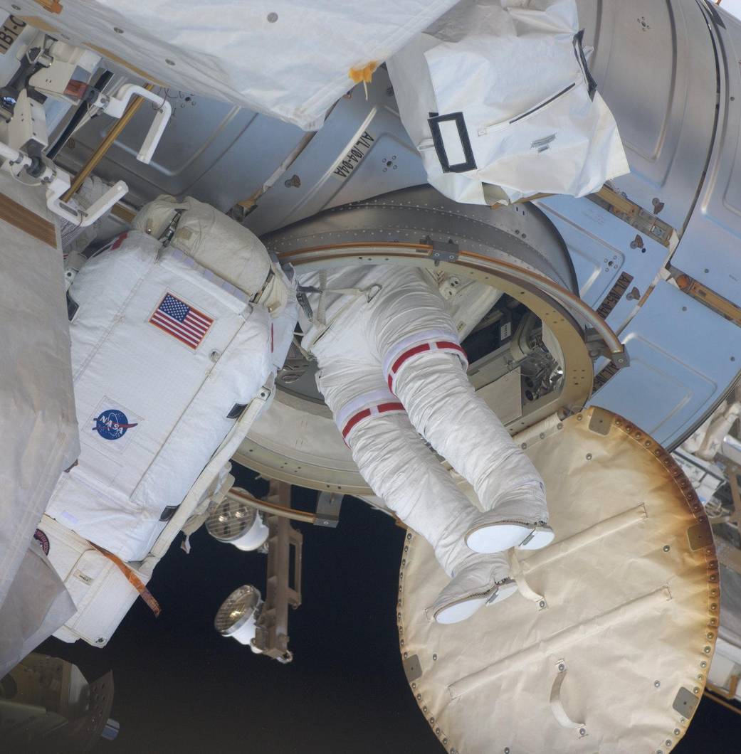 Astronaut Greg Chamitoff made his way inside the station as Andrew Feustel awaited his turn at the end of the STS-134 mission's first spacewalk. The Endeavour astronauts completed a 6-hour, 19-minute spacewalk at the International Space Station Friday, May 20, 2011, retrieving materials experiments and installing another, and installing an antenna.