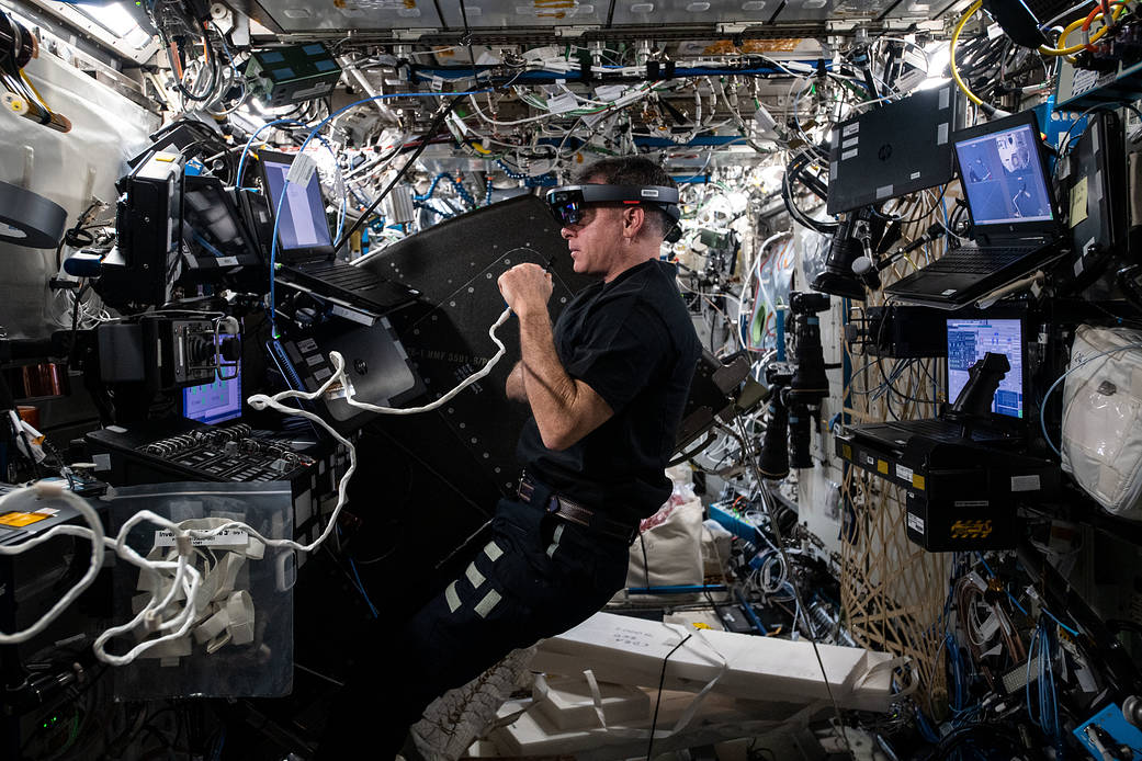 Astronaut Shane Kimbrough wears an augmented reality headset while servicing hardware.