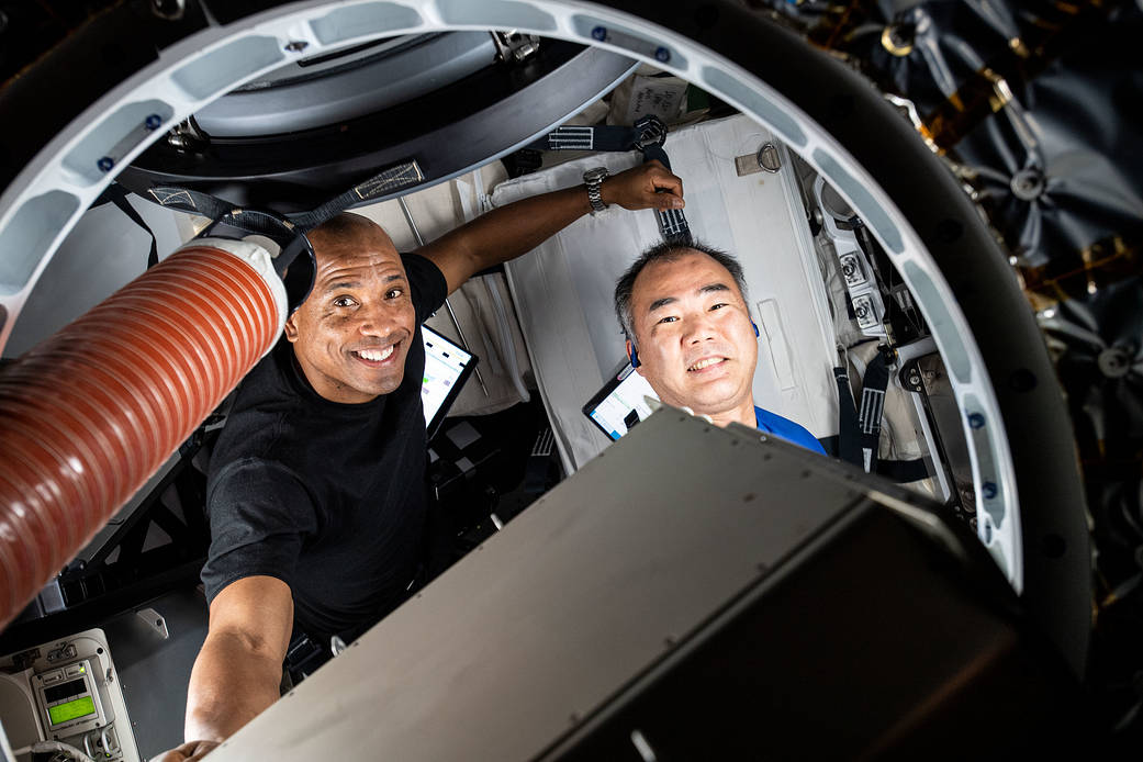 iss064e021982 (Jan. 10, 2021) — Flight Engineers (from left) Victor Glover of NASA and Soichi Noguchi of JAXA are pictured loading cargo inside the SpaceX Cargo Dragon resupply ship a couple of days before its undocking and departure from the International Space Station.