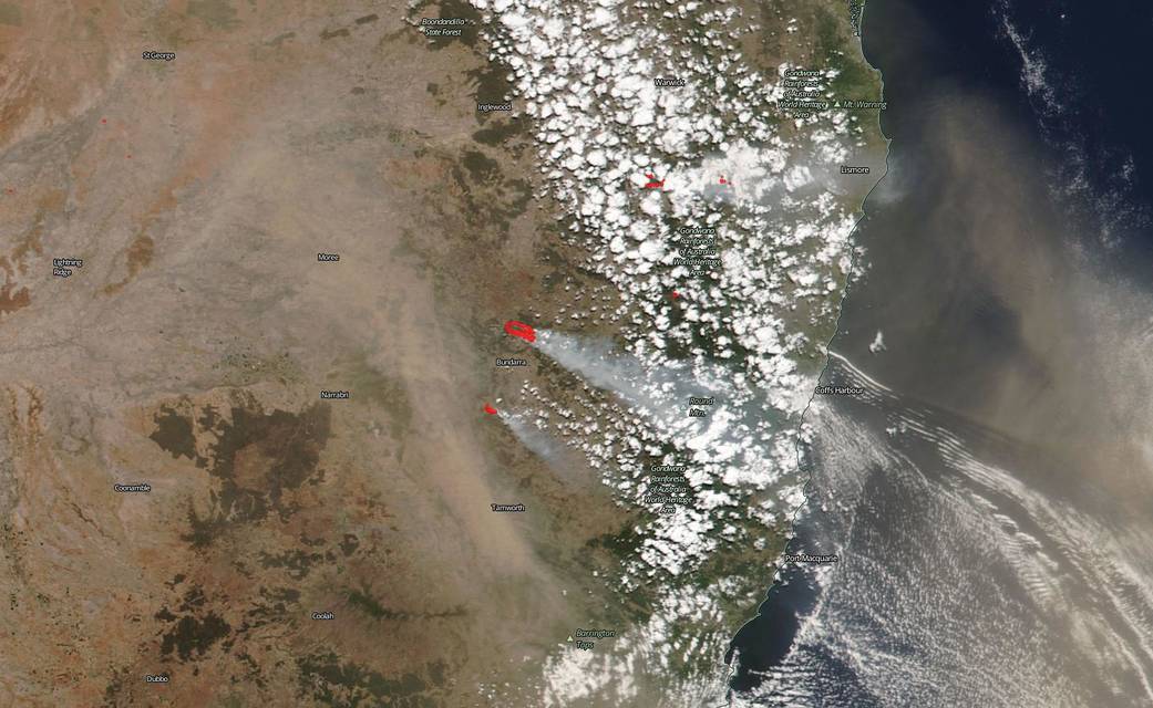 In this image captured by the MODIS instrument on the Aqua satellite on Feb. 13, 2019, fires are burning in New South Wales, Australia. Each hot spot, which appears as a red mark, is an area where the thermal detectors on the MODIS instrument recognized temperatures higher than background. When accompanied by plumes of smoke, as in this image, such hot spots are diagnostic for fire. The smoke released by any type of fire (forest, brush, crop, structure, tires, waste or wood burning) is a mixture of particles and chemicals produced by incomplete burning of carbon-containing materials. All smoke contains carbon monoxide, carbon dioxide and particulate matter or soot. Image Courtesy: NASA Worldview, Earth Observing System Data and Information System (EOSDIS). Caption: Lynn Jenner with information from the Australian Bureau of Meteorology