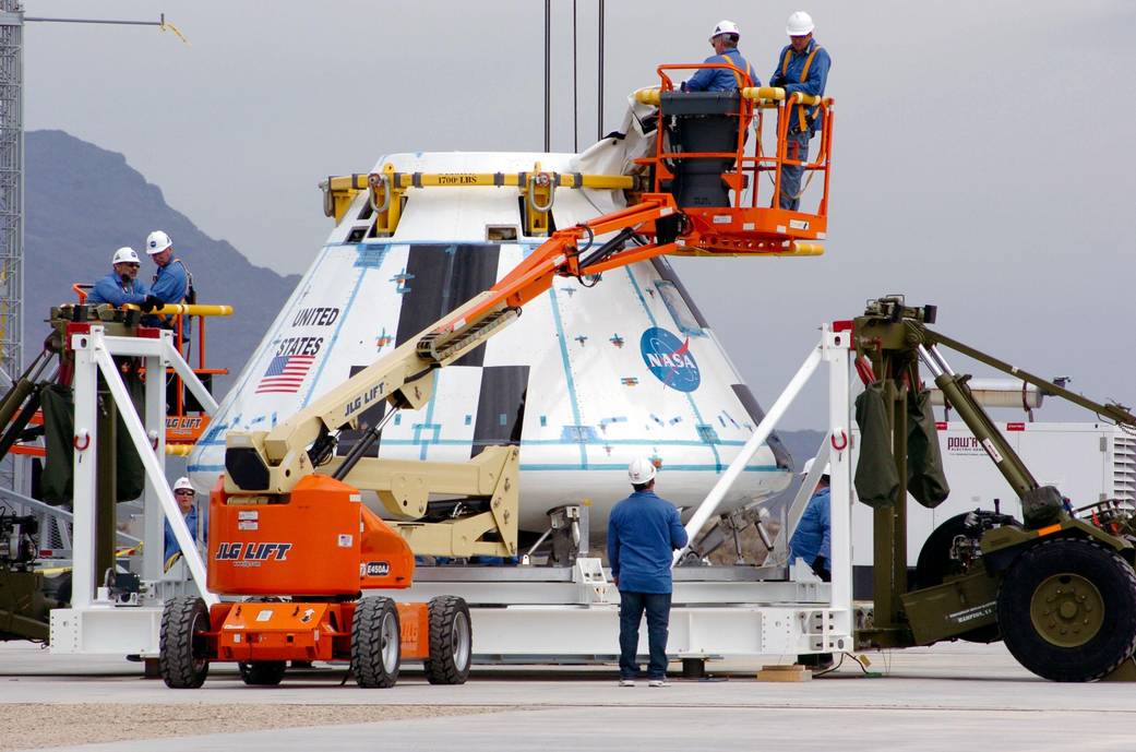 Technicians positioned the boilerplate crew module on the launch pad March 23 in preparation for the Pad Abort-1 (PA-1) flight test at the U.S. Army’s White Sands Missile Range in New Mexico. The integrated flight test was scheduled for May 6.March 23, 2010