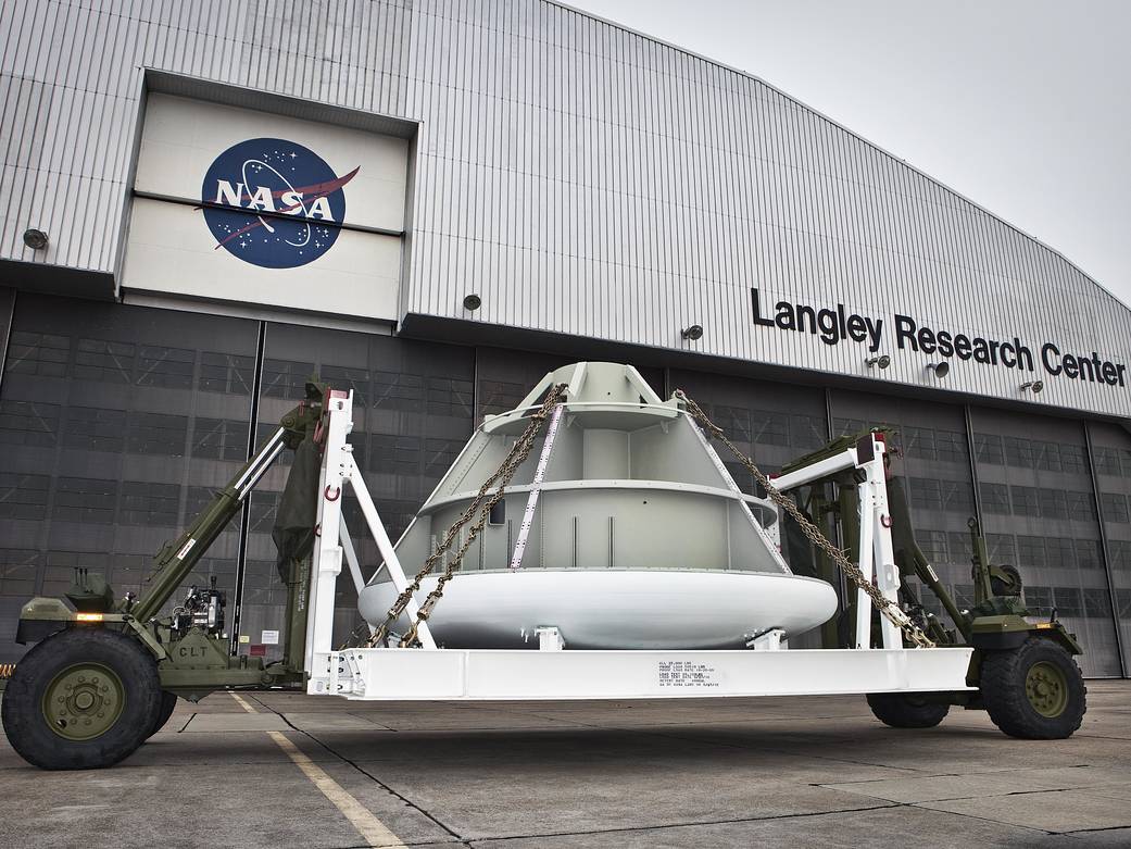 After being painted at Langley Air Force Base this week, the Orion boilerplate test article, or BTA, on Friday was transported back to Building 1262 at NASA Langley where instruments will be installed for test preparation. Built here at NASA Langley, the BTA will be the first piece of hardware to be tested at the new Hydro Impact Basin beginning th