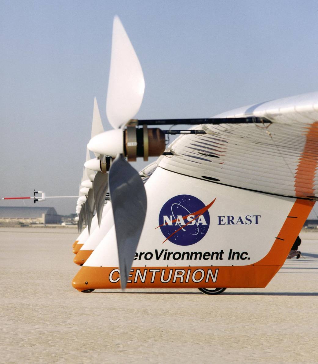 A close-up view of the 14 wide-bladed propellers and electric motors on the Centurion solar-powered, remotely piloted flying wing. This photo was taken during a functional checkout of the aircraft prior to its first test flights at NASA’s Dryden Flight Research Center, Edwards, Calif., in late 1998.Oct 1998NASA Photo / Tom Tschida› Centurion Project Description