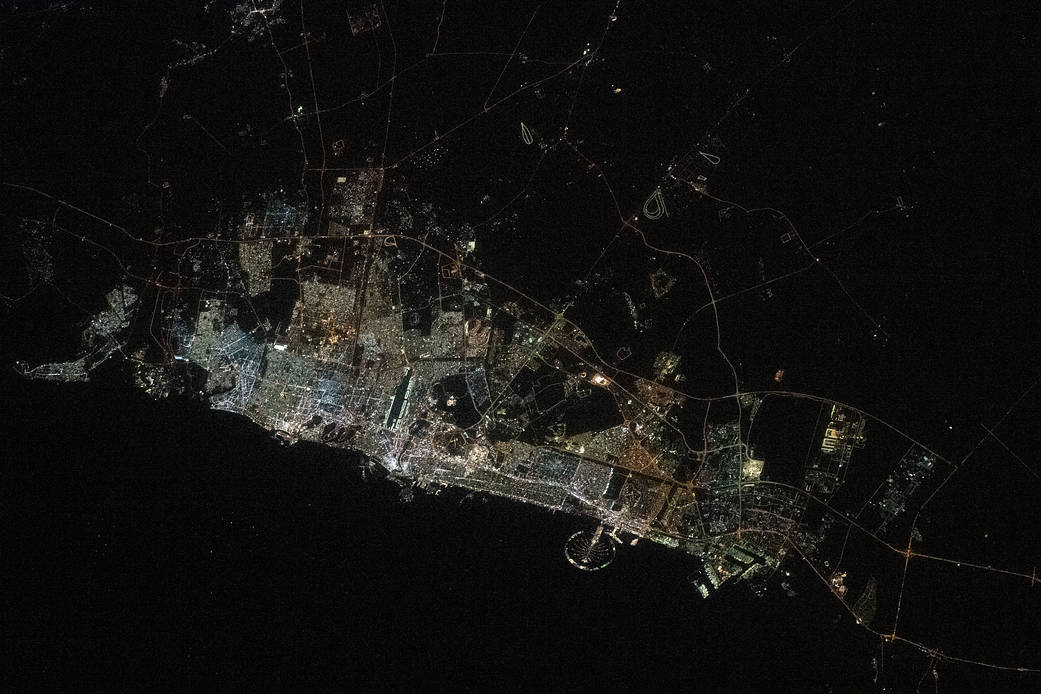 iss068e026591 (Dec. 4, 2022) — The city lights of Dubai, United Arab Emirates, on the coast of the Persian Gulf are pictured from the International Space Station as it orbited 258 miles above.