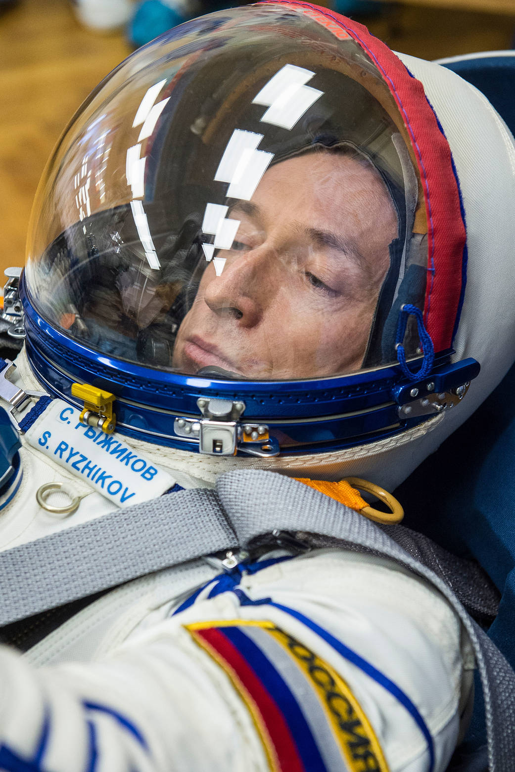 nhq202009280014 (Sept. 28, 2020) — Expedition 64 Russian cosmonaut Sergey Ryzhikov of Roscosmos is seen while having his Sokol suit pressure checked during the Soyuz MS-17 spacecraft fit check, Monday, Sept. 28, 2020, at the Baikonur Cosmodrome in Kazakhstan. Ryzhikov, NASA astronaut Kate Rubins, and Russian cosmonaut Sergey Kud-Sverchkov of Roscosmos are preparing for launch to the International Space Station in their Soyuz MS-17 spacecraft from the Baikonur Cosmodrome in Kazakhstan on October 14, Baikonur time. Photo Credit: (NASA/GCTC/Andrey Shelepin)