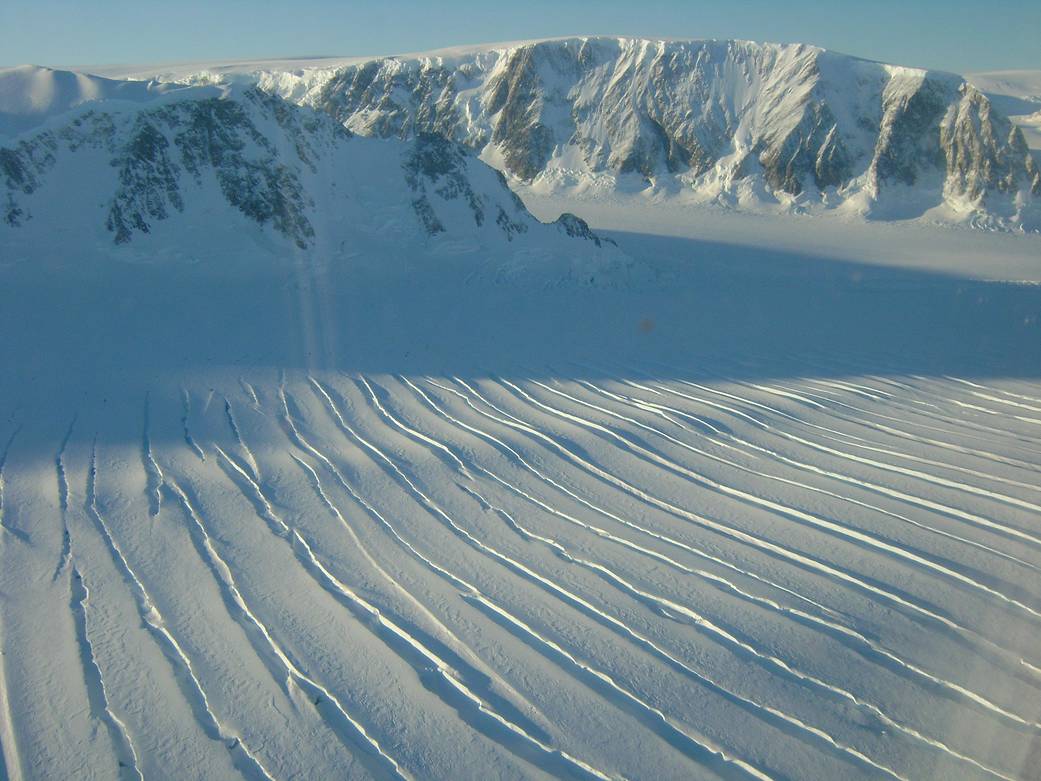 Cracks in the ice could be seen during the Operation Ice Bridge flight on Nov. 4, 2009. The low-altitude flight collected data on the Larsen Ice Shelf and numerous glaciers that exist on the Antarctic Peninsula.