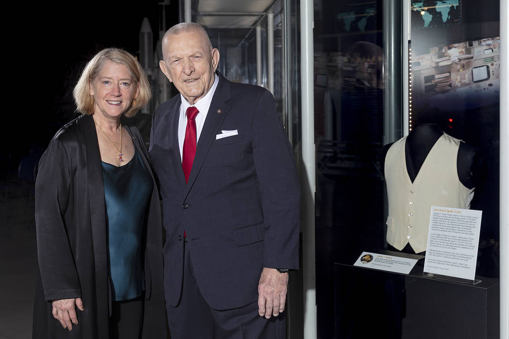 NASA Deputy Administrator Pam Melroy and legendary flight director Gene Kranz posed next to the white vest he wore during the Apollo 13 mission. Apollo 13 was NASA’s “successful failure.” In April 1970, an explosion after launch derailed the lunar-landing mission and forced the astronauts and mission control to improvise solutions to multiple problems to bring the crew home safely, which they did.