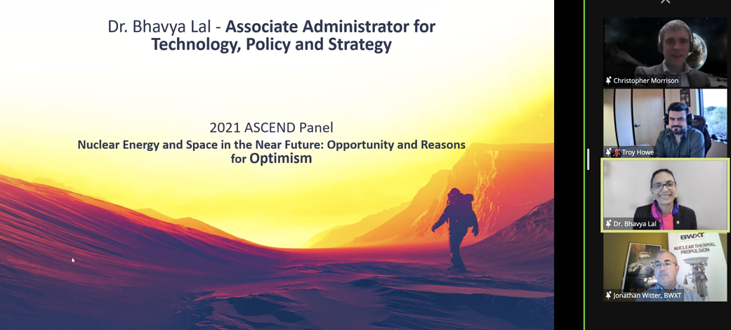 The Office of Technology, Policy and Strategy’s Associate Administrator Dr. Bhavya Lal participated as a panelist during the American Institute of Aeronautics and Astronautics ASCEND conference on Nov. 17. Lal discussed NASA’s policies on space nuclear power and propulsion, and fission surface power.