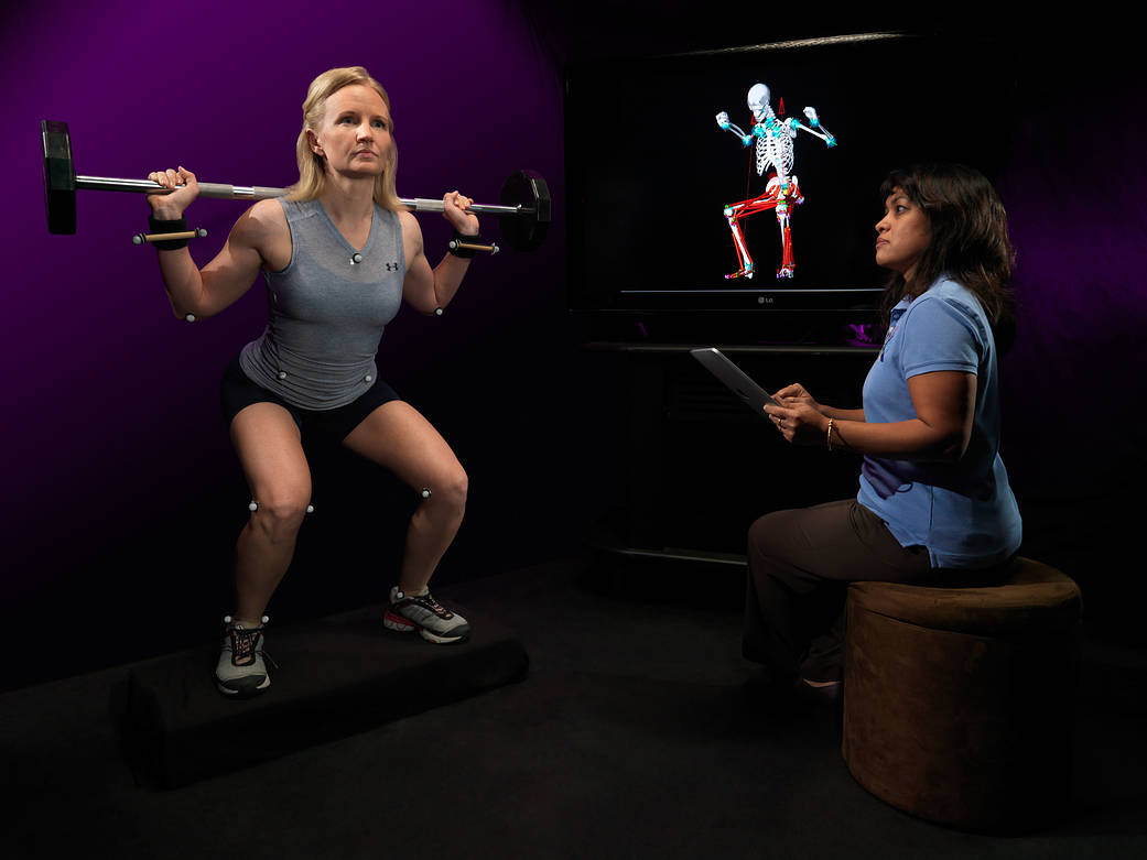 Biomechanical Engineer Renita Fincke monitors Biomechanical Engineer Erin Caldwell as she performs a squat exercise to generate a computational biomechanical model in the Exercise Physiology and Counter Measures Project in Building 261. Photo Date: October 25, 2011.