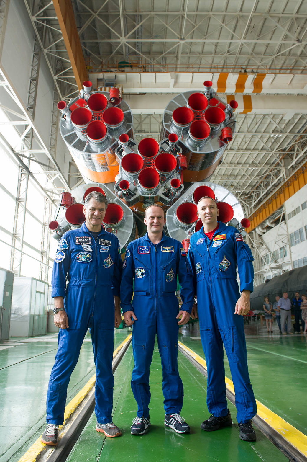 In the Integration Facility at the Baikonur Cosmodrome in Kazakhstan, Expedition 52-53 crewmembers Paolo Nespoli of the European Space Agency (left), Sergey Ryazanskiy of the Russian Federal Space Agency (Roscosmos, center) and Randy Bresnik of NASA (right) pose for pictures in front of the first stage engines of the Soyuz booster rocket July 24 as part of their final fit check dress rehearsal. They will launch July 28 aboard the Soyuz MS-05 spacecraft for a five-month mission on the International Space Station. Credit: Andrey Shelepin/Gagarin Cosmonaut Training Center
