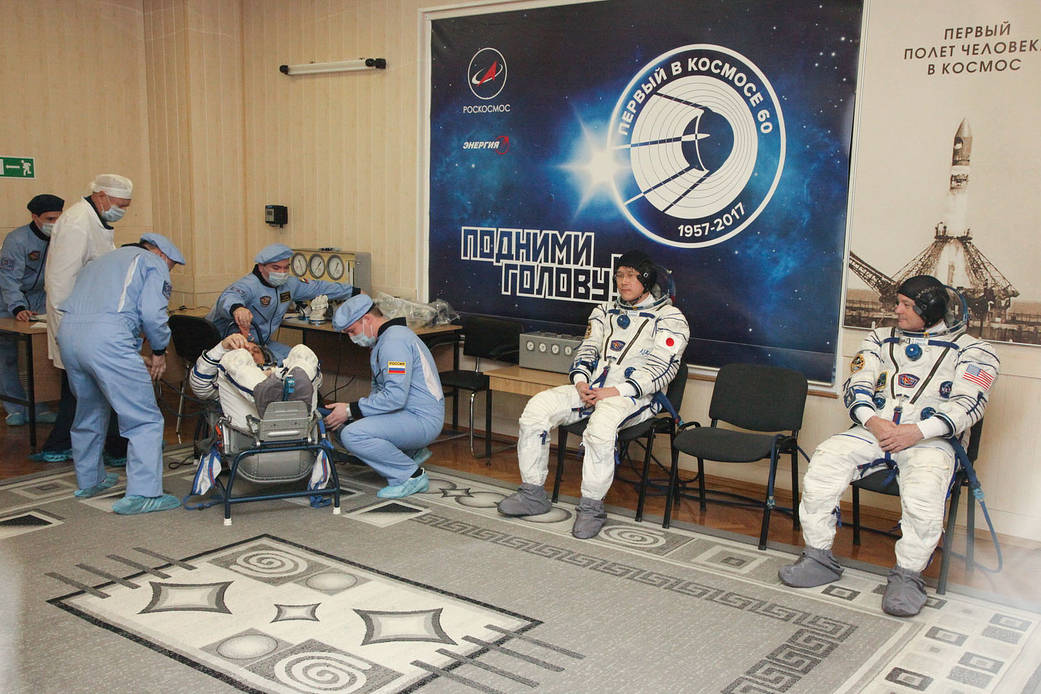 jsc2017e136442 – In the Integration Facility at the Baikonur Cosmodrome in Kazakhstan, Expedition 54-55 crew member Anton Shkaplerov of the Russian Federal Space Agency (Roscosmos) undergoes a leak check on his Sokol launch and entry suit Dec. 5 as part of the first fit check dress rehearsal activities while crewmates Norishige Kanai of the Japan Aerospace Exploration Agency (JAXA, left) and Scott Tingle of NASA (right) look on. They will launch Dec. 17 in the Soyuz MS-07 vehicle for a five-month mission on the International Space Station…Courtesy of Roscosmos