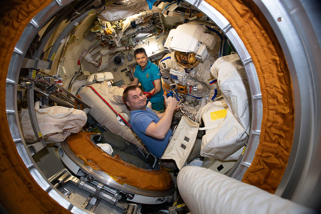 iss059e072275 (May 23, 2019) — Expedition 59 Flight Engineer Alexey Ovchinin (foreground) and Commander Oleg Kononenko ready a pair of Russian Orlan spacesuits inside the Pirs docking compartment’s airlock. Ovchinin and Kononenko are due to conduct the fourth spacewalk of 2019 for space station maintenance on May 29.