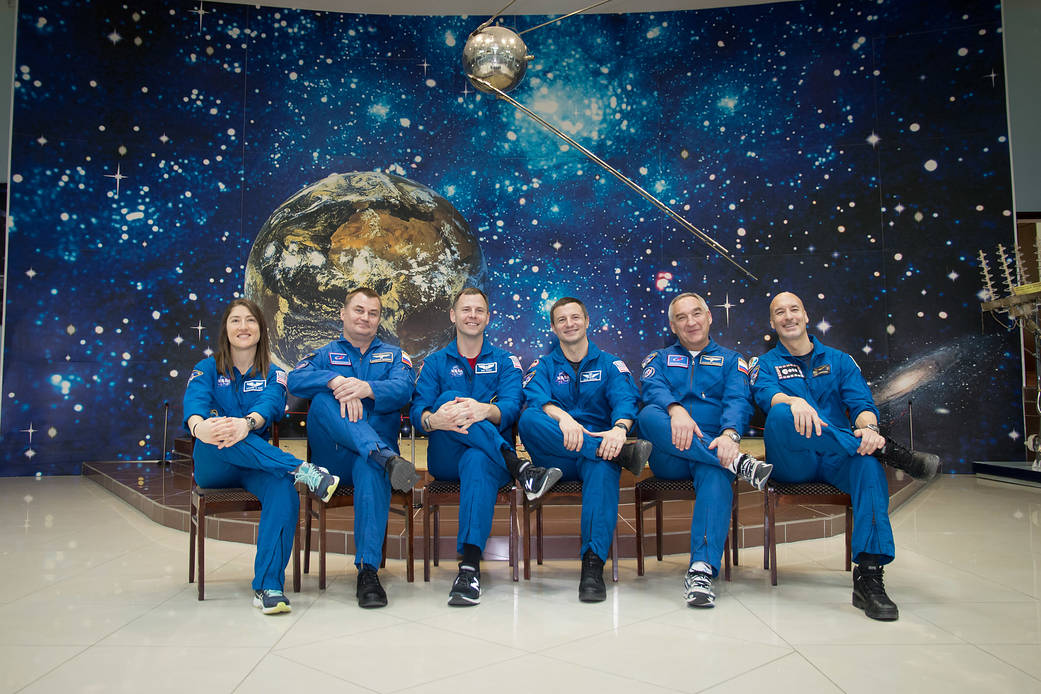 jsc2019e013419 (March 10, 2019) — At the Baikonur Cosmodrome Museum in Kazakhstan, a model of the world’s first satellite, Sputnik, serves as a hanging backdrop March 10 as the Expedition 59 prime and backup crewmembers pose for pictures in traditional pre-launch activities. From left to right are the prime crew members, Christina Koch of NASA, Alexey Ovchinin of Roscosmos and Nick Hague of NASA, and the backup crew members, Drew Morgan of NASA, Alexander Skvortsov of Roscosmos and Luca Parmitano of the European Space Agency. Koch, Hague and Ovchinin will launch March 14, U.S. time, in the Soyuz MS-12 spacecraft from the Baikonur Cosmodrome for a six-and-a-half month mission on the International Space Station. Credit: NASA/Victor Zelentsov