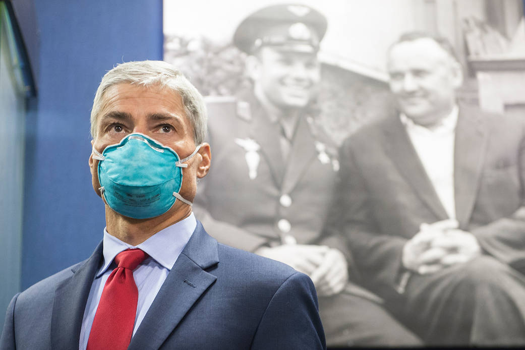 nhq202009240028 (Sept. 24, 2020) — Expedition 64 backup crew member, NASA astronaut Mark Vande Hei, is seen at the conclusion of a press conference, Thursday, Sept. 24, 2020 at the Gagarin Cosmonaut Training Center (GCTC) in Star City, Russia. Photo Credit: (NASA/GCTC/Andrey Shelepin)