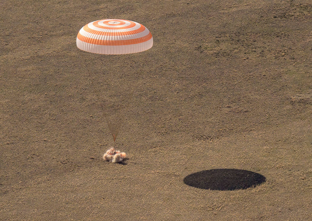 nhq202104170100 (April 17, 2021) — The Soyuz MS-17 spacecraft is seen as it lands in a remote area near the town of Zhezkazgan, Kazakhstan with Expedition 64 crew members Kate Rubins of NASA, Sergey Ryzhikov and Sergey Kud-Sverchkov of Roscosmos, Saturday, April 17, 2021. Rubins, Ryzhikov and Kud-Sverchkov returned after 185 days in space having served as Expedition 63-64 crew members onboard the International Space Station. Photo Credit: NASA/Bill Ingalls
