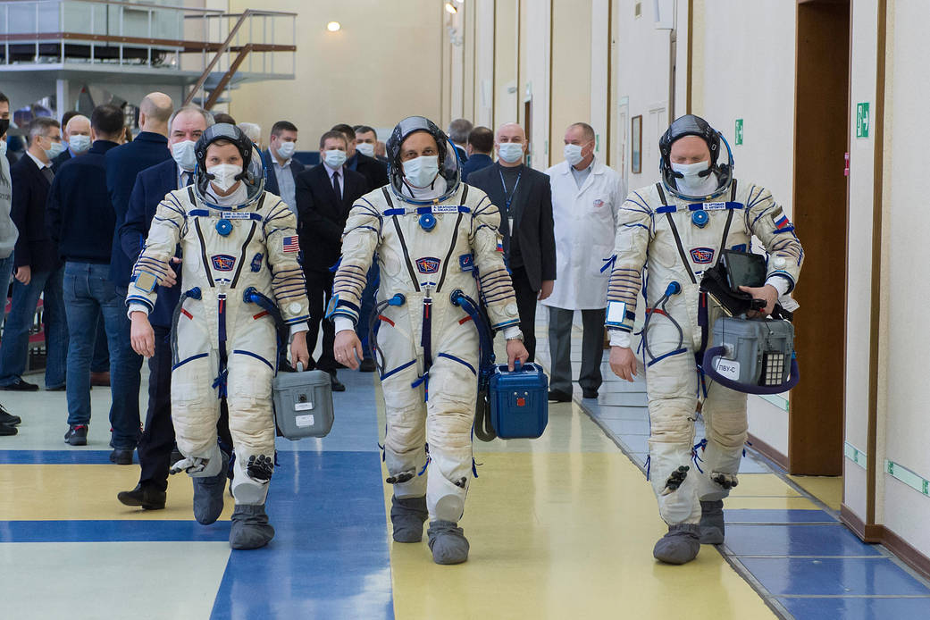 nhq202103220042 (March 22, 2021) — Expedition 65 backup crew members NASA astronaut Anne McClain, left, Russian cosmonaut Anton Shkaplerov of Roscosmos, center, and Russian cosmonaut Oleg Artemyev of Roscosmos arrive for Soyuz qualification exams Monday, March 22, 2021 at the Gagarin Cosmonaut Training Center (GCTC) in Star City, Russia, in advance of the Expedition 65 launch April 9 from Baikonur Cosmodrome in Kazakhstan to the International Space Station. Photo Credit: (NASA/GCTC/Irina Spector)