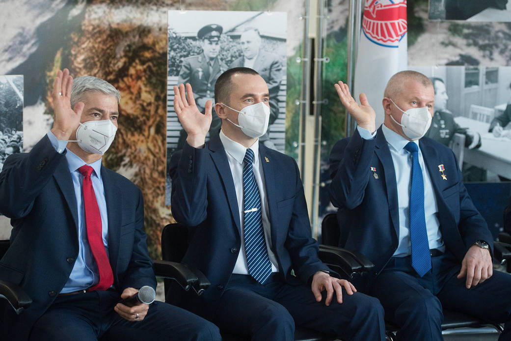 nhq202103240016 (March 2021) — Expedition 65 crew members NASA astronaut Mark Vande Hei, left, Russian cosmonaut Pyotr Dubrov of Roscosmos, center, and Russian cosmonaut Oleg Novitskiy of Roscosmos, wave during a press conference prior to their launch from the Baikonur Cosmodrome, Wednesday, March 24, 2021 at the Gagarin Cosmonaut Training Center (GCTC) in Star City, Russia. Photo Credit: (NASA/GCTC/Andrey Shelepin)