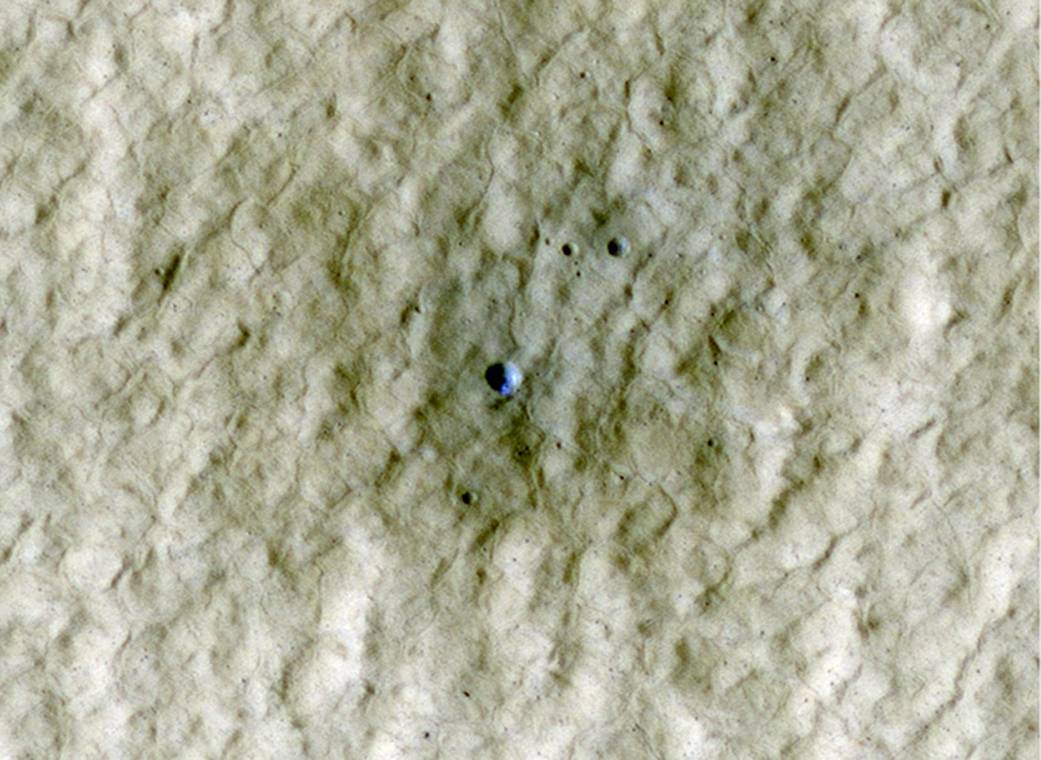 At the center of this view of an area of mid-latitude northern Mars, a fresh crater about 6 meters (20 feet) in diameter holds an exposure of bright material, blue in this false-color image. The High-Resolution Imaging Science Experiment (HiRISE) camera on NASA’s Mars Reconnaissance Orbiter made this observation on June 20, 2010. Previous HiRISE images of fresh craters in the middle to high northern latitudes show exposed water ice on the poleward-facing slopes (see: https://www.nasa.gov/mission_pages/MRO/news/mro-20090924r.html). Here is another example. This crater formed sometime between April 2004 and January 2010, as determined from before-and-after images acquired by the Thermal Emission Imaging System camera on NASA’s Mars Odyssey orbiter and the Context Camera on the Mars Reconnaissance Orbiter. This HiRISE image was acquired in northern Mars’ early summer, when frost at this latitude is not expected. Scientists propose that the bright material at the crater is subsurface ice exposed by the impact that excavated the crater. This image spans a distance of about 170 meters (about 560 feet) and is presented in false color, which aids in distinguishing among surface materials and textures. It is a portion of the HiRISE observation catalogued as ESP_018273_2245, of an area at 44 degrees north latitude, 180 degrees east longitude. Other image products from this observation are available at http://hirise.lpl.arizona.edu/ESP_018273_2245. NASA’s Jet Propulsion Laboratory, a division of the California Institute of Technology in Pasadena, Calif., manages the Mars Reconnaissance Orbiter for NASA’s Science Mission Directorate, Washington. Lockheed Martin Space Systems, Denver, built the spacecraft. The High Resolution Imaging Science Experiment is operated by the University of Arizona, Tucson, and the instrument was built by Ball Aerospace & Technologies Corp., Boulder, Colo. Image Credit: NASA/JPL-Caltech/University of Arizona
