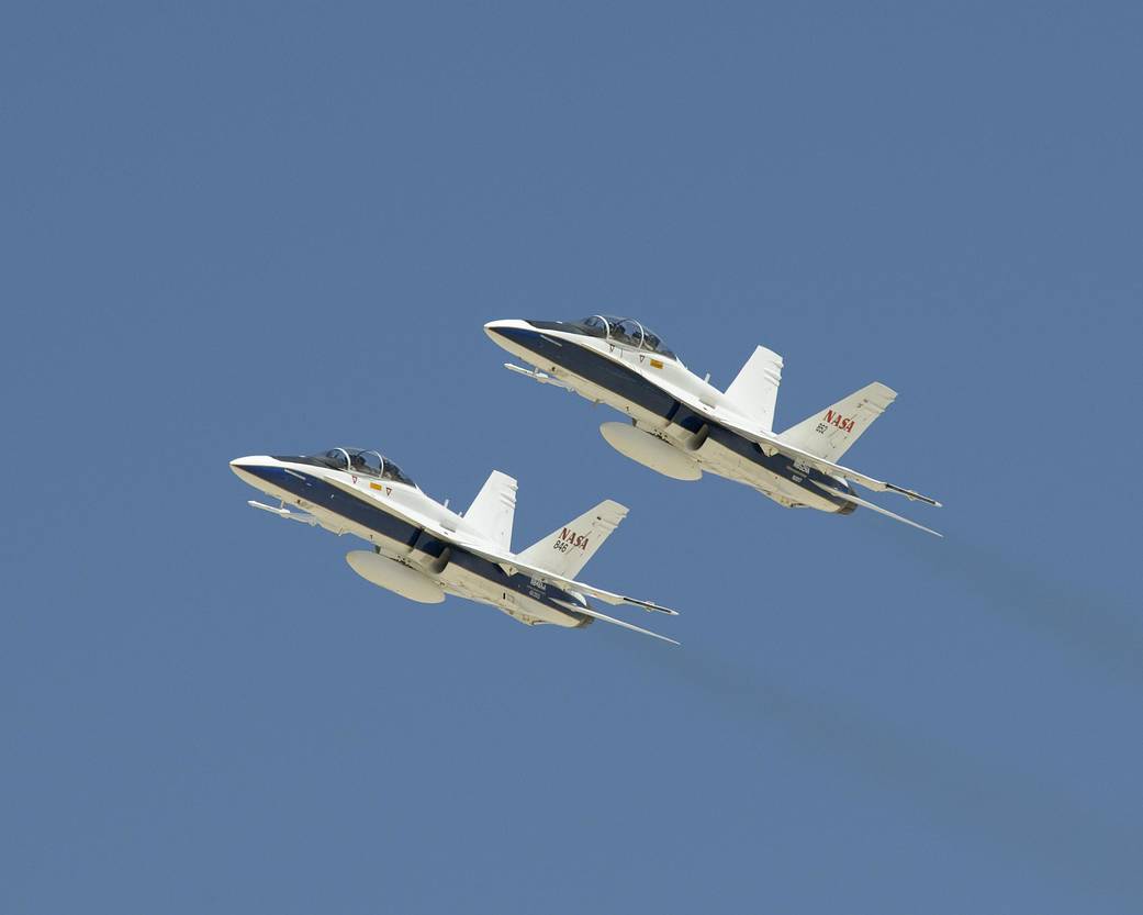 Two NASA F/A-18B aircraft are captured in tight formation during a low-level flyover of NASA’s Dryden Flight Research Center. NASA Dryden has flown the early-model two-seat F/A-18s for mission support duties and for occasional research missions since acquiring them from the U.S. Navy in the mid-1980s.August 27, 2010NASA Dryden / Tony Landis