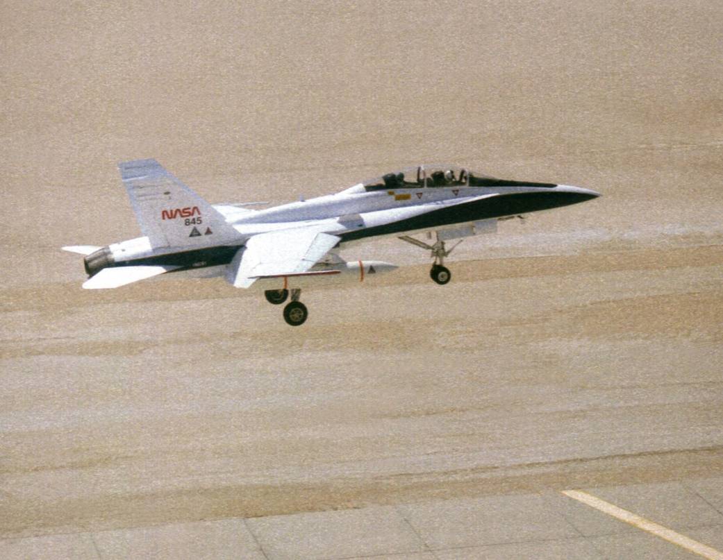 A highly modified F/A-18B Hornet flown by NASA’s Dryden Flight Research Center settles toward the runway at Edwards Air Force Base following another research flight. Known as the Systems Research Aircraft (SRA), the two-seat F/A-18 was engaged in a multi-year project to evaluate advanced control subsystems and sensors.May 1996NASA Photo / › F-18 SRA Project Description