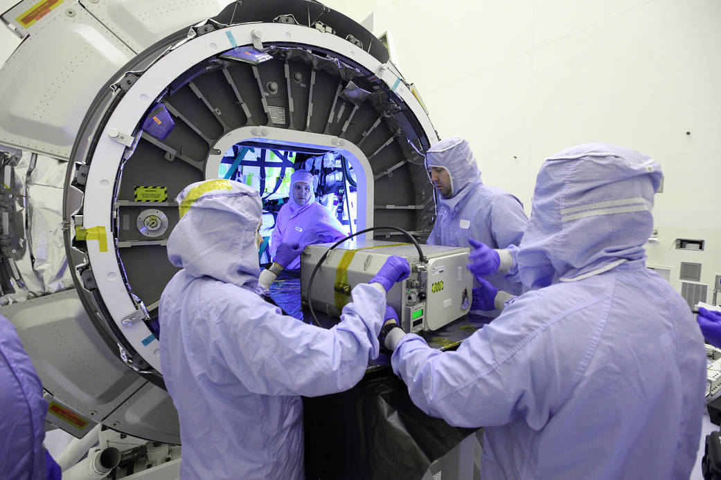Inside the Payload Hazardous Servicing Facility at NASA’s Kennedy Space Center in Florida, technicians perform final cargo installation in the Orbital ATK Cygnus pressurized cargo module. The Orbital ATK CRS-7 commercial resupply services mission to the International Space Station is scheduled to launch atop a United Launch Alliance Atlas V rocket from Space Launch Complex 41 at Cape Canaveral Air Force Station targeted for March 24, 2017. Cygnus will deliver 7,600 pounds of supplies, equipment and scientific research materials to the space station. Photo credit: NASA/Bill White