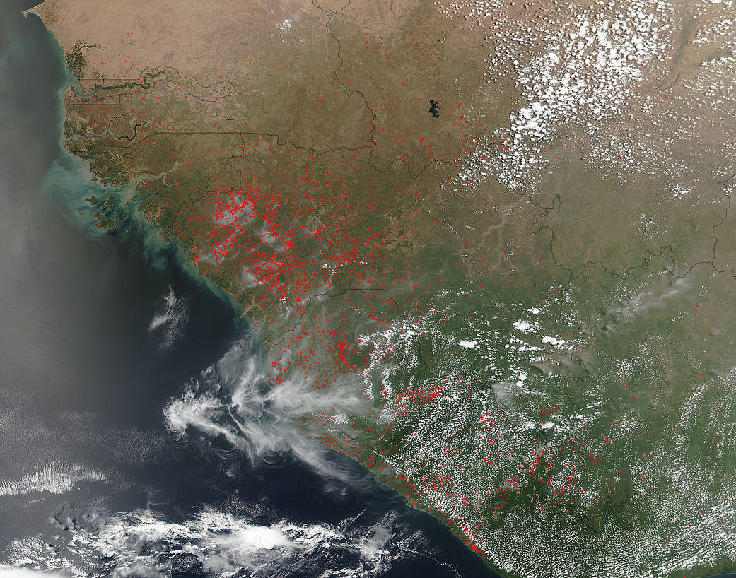 NASA’s Suomi NPP satellite collected this natural-color image using the VIIRS (Visible Infrared Imaging Radiometer Suite) instrument on April 30, 2016. The location, widespread nature, and number of fires suggest that these fires were deliberately set to manage land. Actively burning areas are outlined in red. Farmers often use fire to return nutrients to the soil and to clear the ground of unwanted plants.