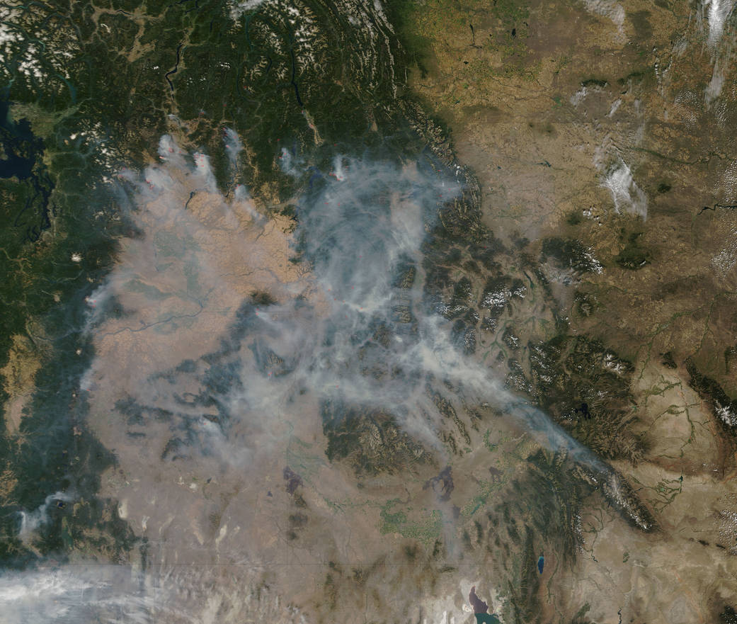 The Moderate Resolution Imaging Spectroradiometer (MODIS) instrument that flies aboard NASA’s Terra satellite captured an image of smoke from multiple fires burning in Washington, Oregon and Idaho on Aug. 19, 2015, at 2:20 p.m. EDT (18:20 UTC). The multiple red pixels are heat signatures detected by MODIS. The smoke appears to be a light brown color.