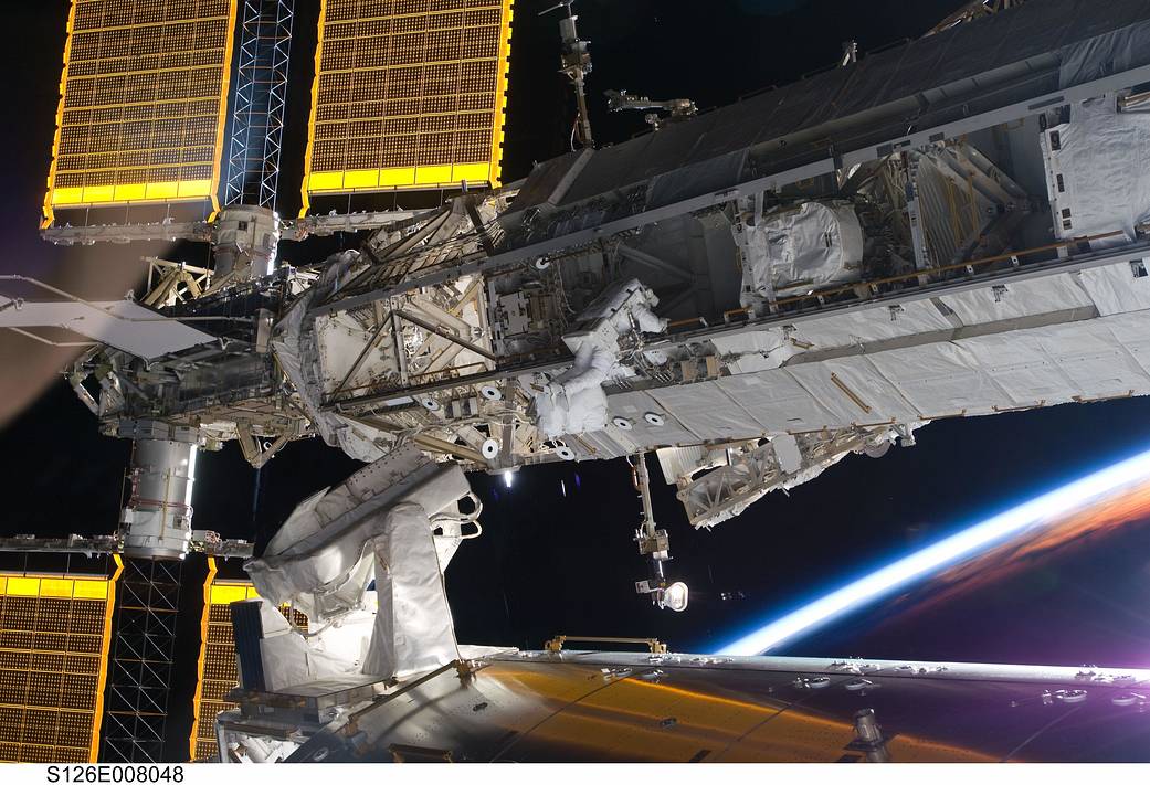STS-126 astronaut Steve Bowen and Heidemarie Stefanyshyn-Piper (out of frame) worked to clean and lubricate part of the station’s starboard Solar Alpha Rotary Joints (SARJ) and to remove two of SARJ’s 12 trundle bearing assemblies. The spacewalkers also removed a depleted nitrogen tank from a stowage platform on the outside of the complex and moved it into Endeavour’s cargo bay. They also moved a flex hose rotary coupler from the shuttle to the station stowage platform, as well as removing some insulation blankets from the common berthing mechanism on the Kibo laboratory.Image Credit: NASA