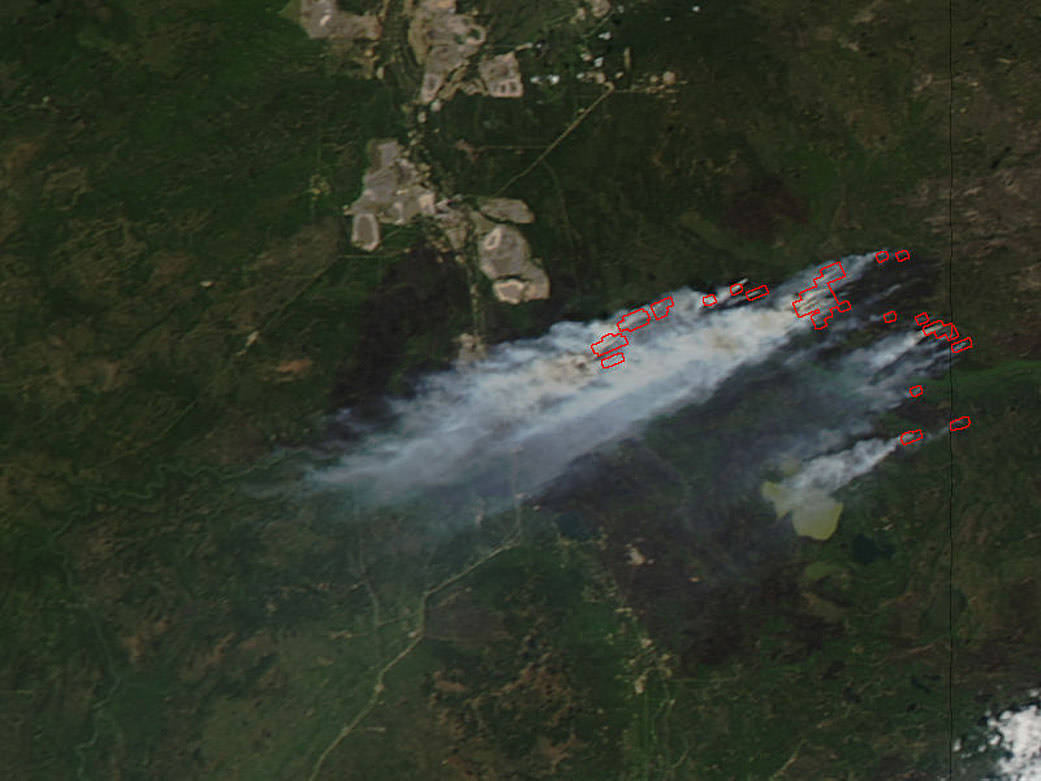 NASA’s Aqua satellite collected this natural-color image of the Fort McMurray fire complex in Alberta, Canada with the Moderate Resolution Imaging Spectroradiometer, MODIS, instrument on May 23, 2016. Smoke still rises in huge columns above the fires and actively burning areas, detected by MODIS’s thermal bands, are outlined in red. NASA image courtesy Jeff Schmaltz LANCE/EOSDIS MODIS Rapid Response Team, GSFC. Caption by Lynn Jenner