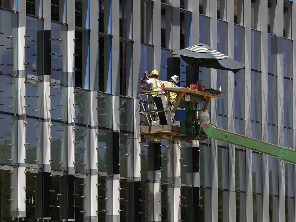 Construction workers working on an elevated platforms while installing the exterior glass panels to the south side of the Integrated Engineering Service Building. The two men attempt to use a beach umbrella to shield themselves from the direct and reflected light of the summer sun.