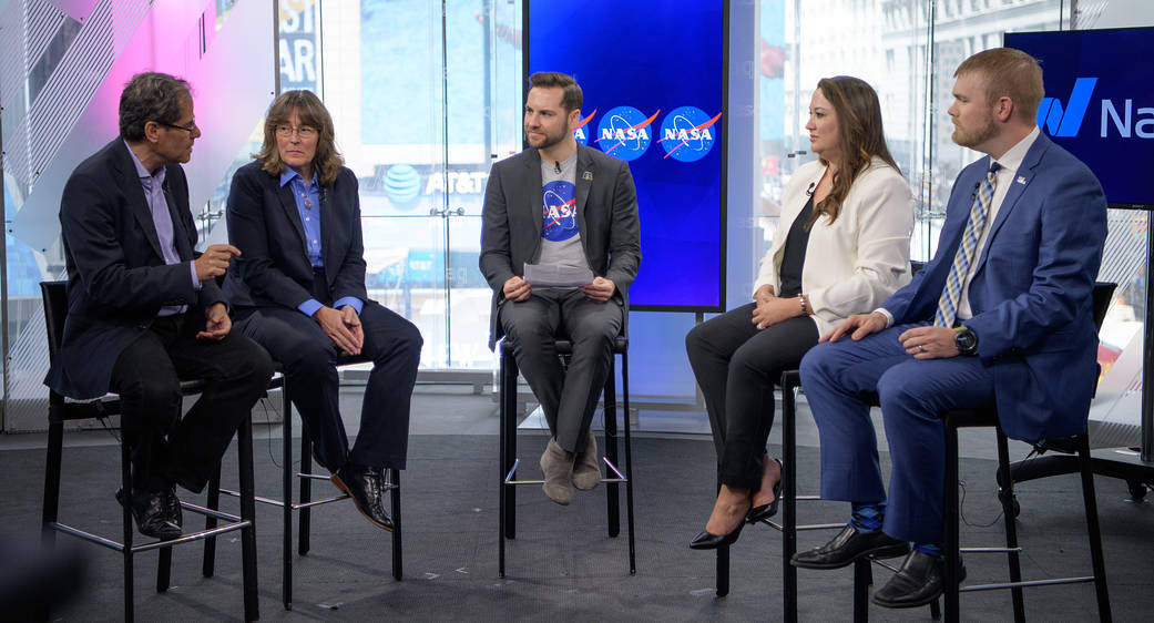 Josh Machiz, Chief Digital Officer, Nasdaq, center, talks with NanoRacks CEO Jeff Manber, left, NASA Manager of the International Space Station Research Office Marybeth Edeen, AlphaSpace Founder and Chairman Stephanie Murphy, and Made in Space Vice President of Advanced Programs and Concepts Justin Kugler, right, during a live social media event shortly after NASA announced a five-part plan to open the International Space Station to expanded commercial and marketing activities and private astronaut missions to the station and enable additional commercial destinations in low-Earth orbit, Friday, June 7, 2019 at the Nasdaq MarketSite in New York City. NASA will continue to maintain human presence and research in low-Earth orbit, and the long-term goal is to achieve a robust economy from which NASA can purchase services at a lower cost.