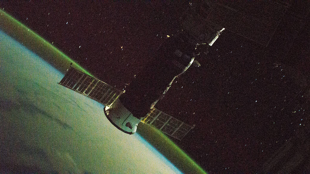 iss064e035806 (Feb. 21, 2021) — The International Space Station, pictured with Russia’s ISS Progress 77 cargo craft attached to the Pirs docking compartment, orbits into a sunset 270 miles above the South Pacific. This long duration photograph also shows Earth’s airglow (a faint emission of light in the upper atmosphere) and a starry night sky.