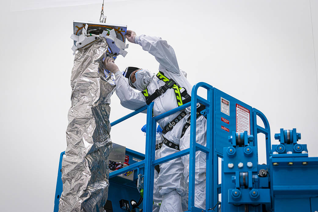 A Ball Aerospace engineer prepares the Imaging X-Ray Polarimetry Explorer spacecraft boom for testing at Ball’s Boulder, Colorado, test facility. A joint mission by NASA and the Italian Space Agency, IXPE will measure the polarization of cosmic X-rays to further understanding of the fundamental physics of extreme and exotic objects in the universe,