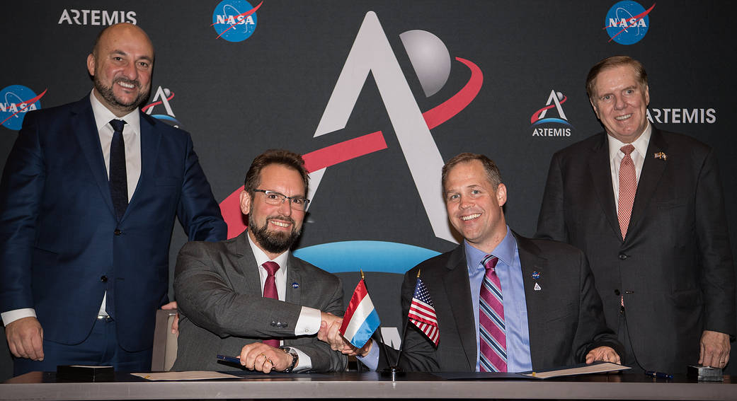 NASA Administrator Jim Bridenstine, right, and Dr. Marc Serres, chief executive officer, Luxembourg Space Agency (LSA), left, shake hands after signing a joint statement on Oct. 22, 2019, during the 70th International Astronautical Congress in Washington. The two agencies have expressed interest in furthering cooperation in lunar exploration, with a particular emphasis on advancing commercial opportunities. They also agreed to pursue a framework agreement that will facilitate future cooperation on NASA’s Artemis program that will return humans to the surface of the Moon by 2024 and will create exciting future opportunities for sustainable activities on and around the Moon.