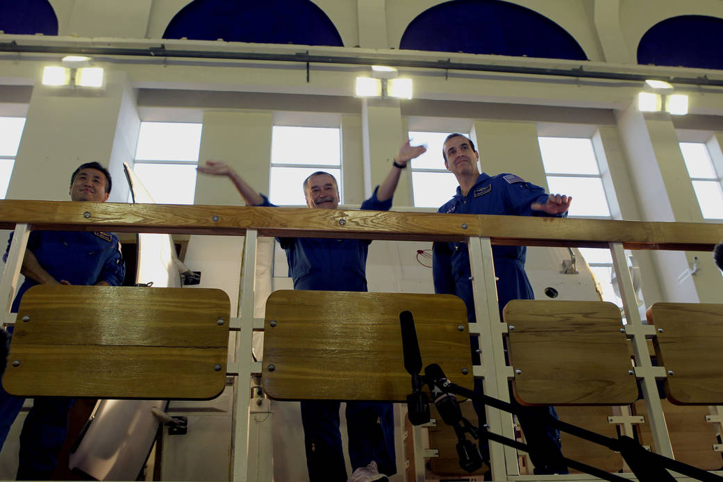 JSC2013-E-090225 (15 Oct. 2013) — At the Gagarin Cosmonaut Training Center in Star City, Russia, Expedition 38 Soyuz Commander Mikhail Tyurin (center) gestures as he, Flight Engineer Koichi Wakata of the Japan Aerospace Exploration Agency (left) and NASA Flight Engineer Rick Mastracchio (right) answered questions from reporters before the start of their flight qualification exam simulations Oct. 15, 2013. The trio is scheduled to launch on Nov. 7, local time, from the Baikonur Cosmodrome in Kazakhstan on the Soyuz TMA-11M spacecraft for a six-month mission on the International Space Station. Photo credit: NASA