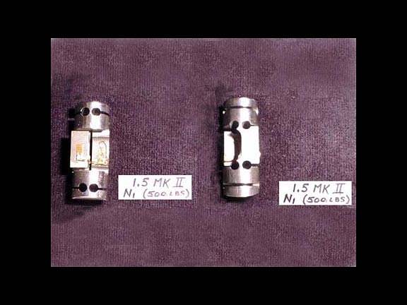 Closeup view N1 gage element front and side. Strain gage attached to portion which senses stress in one alignment only. Gage, minus wiring, from a 1.5 inch Mk2 balance that was dis-assembled (other flexures broke).