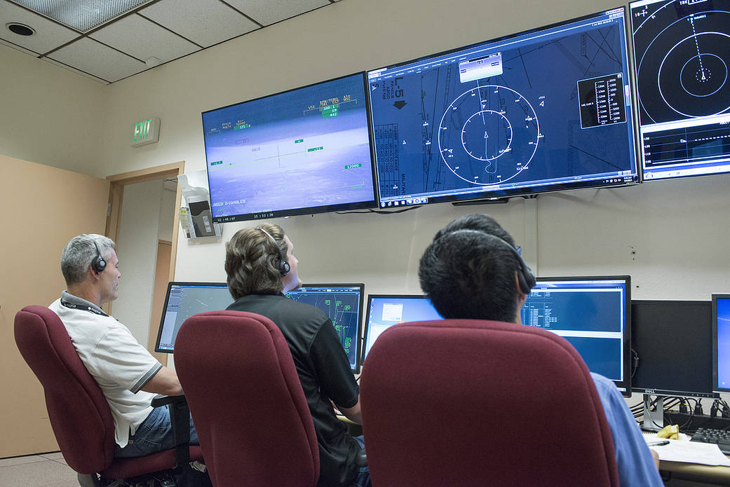 NASA researchers (from left) Martin Hoffman, John Freudinger, and Ed Koshimoto observe one of the FT3 tests from the Research Ground Control Station at NASA Armstrong.