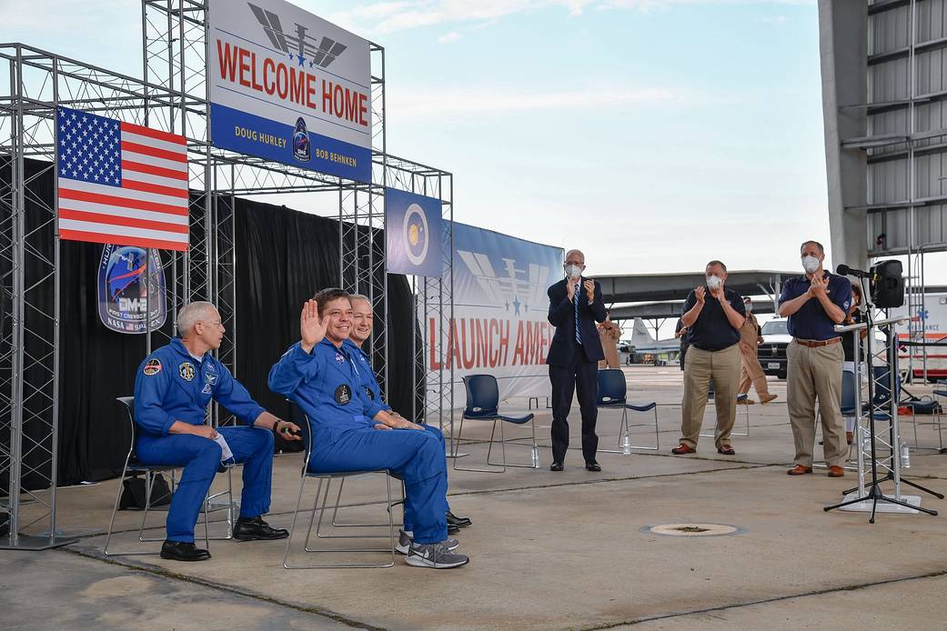 NASA Administrator Jim Bridenstine (far right) applauds astronauts Robert Behnken (second from left) and Douglas Hurley (third from left) at a ceremony on Aug. 2, 2020, at Ellington Field Joint Reserve Base in Houston. Behnken and Hurley had earlier splashed down in Gulf of Mexico in the Crew Dragon Endeavour, ending NASA’s SpaceX Demo MIssion-2. The flight marked the first launch and landing of American astronauts in a commercially built and operated spacecraft. Also shown are Patrick Forrester, head of the astronaut office (far left); Mark Geyer, director of the Johnson Space Center (third from right) and NASA Deputy Administrator Jim Morhard (second from right).