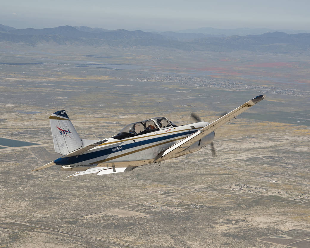 NASA’s T-34 aircraft flies over an abundance of yellow wildflowers as it heads toward Southern California’s Antelope Valley Poppy Reserve. The aircraft was flown from the agency’s Armstrong Flight Research Center.