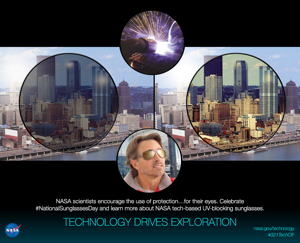 This Saturday, June 27 is National Sunglasses Day, which serves as a reminder to consumers to protect their eyes from harmful UV rays. NASA technology, originally developed to block the intense light emitted from lasers or during welding, was commercialized and adapted by Eagle Eyes Optics of Calabasas, California. The company utilized the space technology to develop sunglasses that promise 100-percent elimination of harmful wavelengths and enhanced visual clarity. The Eagle Eyes lens (right) makes scenes more vivid because harmless wavelength colors such as red, orange, yellow, and green are enhanced, and damaging rays in the blue, violet, and ultraviolet (UV) wavelengths are blocked. For more information on this spinoff technology, read: https://spinoff.nasa.gov/Spinoff2010/hm_3.html.