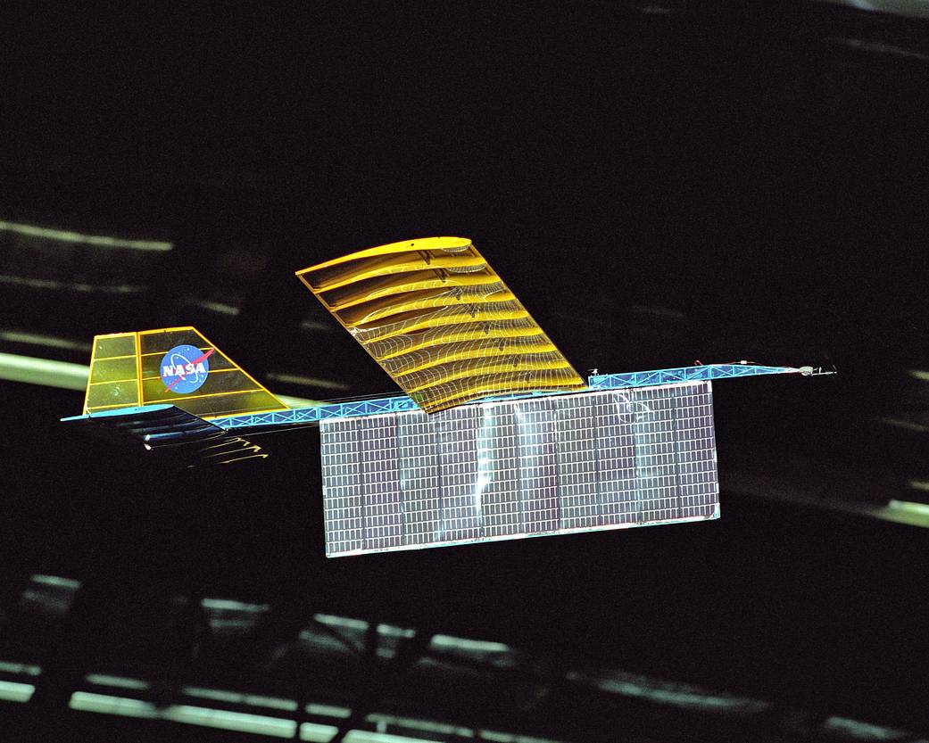 An experimental radio-controlled model aircraft is seen here in flight, powered only by light energy beamed to it by a spotlight. Researchers from NASA’s Marshall Space Flight Center, Huntsville, AL, and Dryden Flight Research Center, Edwards, CA, and the University of Alabama in Huntsville have flight-demonstrated a small-scale aircraft that flies solely by means of propulsive power from an invisible, ground-based infrared laser.August 1, 2002NASA Photo / Tom Tschida› Power Beaming Project Description