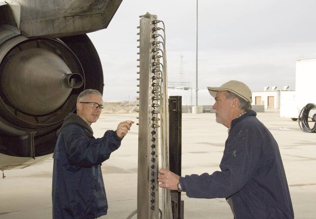 Brad Besheres of the U.S. Army's Arnold Engineering Development Center explained probe arrangement on an engine exhaust sampling rake to project scientist Bruce Anderson of NASA's Langley Research Center.