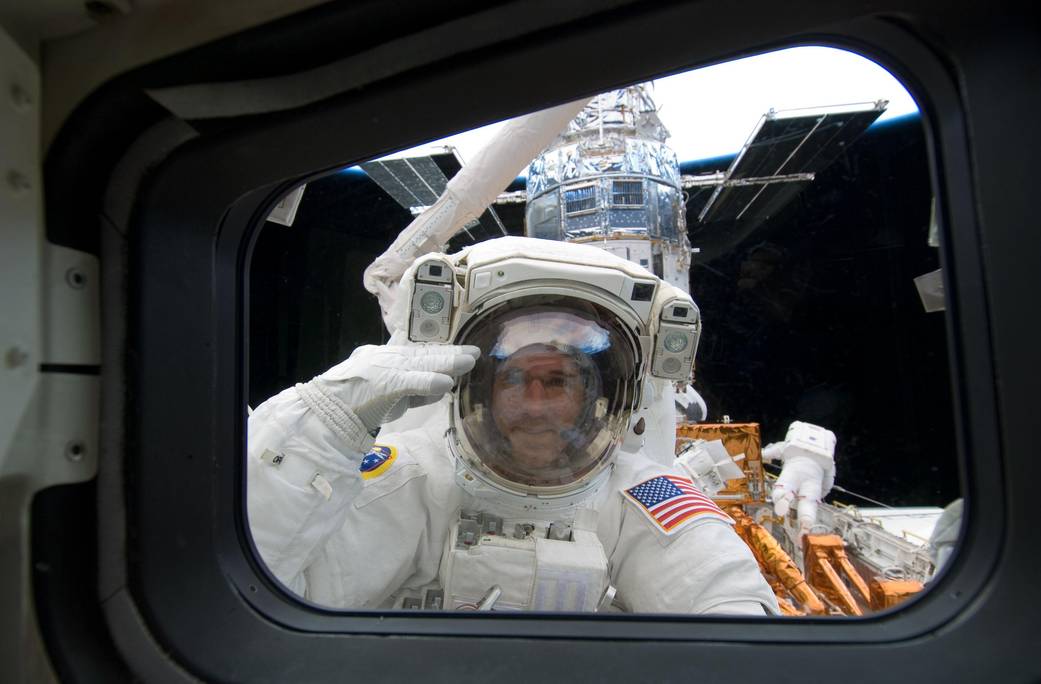 Good and Mike Massimino (background right) are working on the Hubble Space Telescope locked down in the orbiter’s cargo bay.