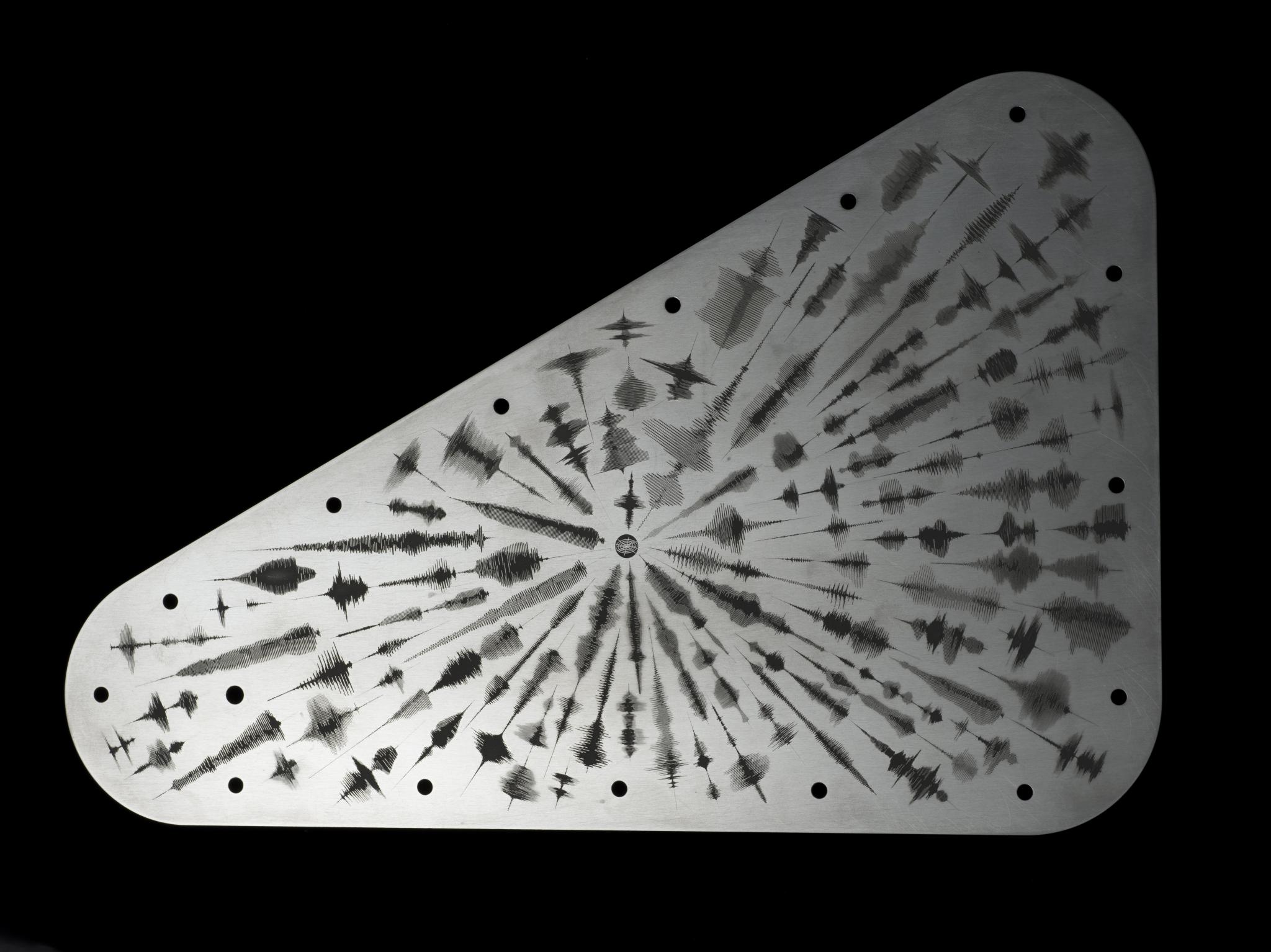 This image from March 8, 2024, shows waveforms of the word “water” in 103 languages etched onto a triangular metal plate. The plate will be attached to the Europa Clipper spacecraft, set to fly to one of Jupiter’s moons, Europa, after it launches in October 2024.