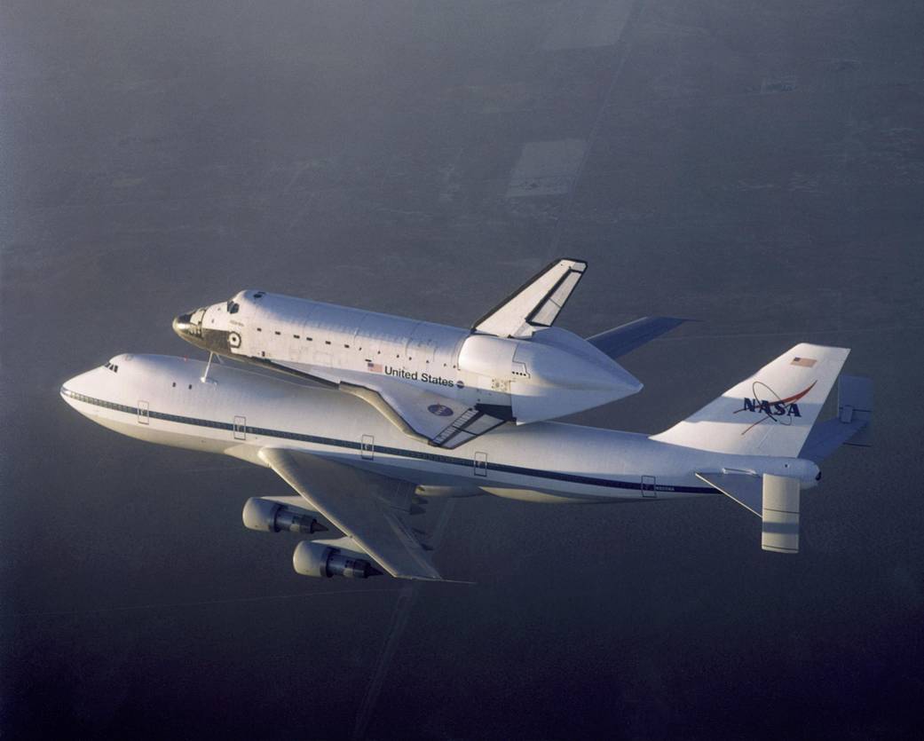 A look-down view on the Space Shuttle orbiter Atlantis piggy-backed on top of one of NASA’s Boeing 747 Shuttle Carrier Aircraft (SCA) as it departs California for the Kennedy Space Center, Florida in September 1998.September 1998NASA Photo / Carla Thomas› SCA Project Description