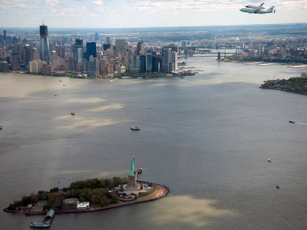 The prototype space shuttle Enterprise, mounted atop a NASA 747 Shuttle Carrier Aircraft 905, is seen as it flies near the Statue of Liberty and the Manhattan skyline in New York on Friday, April 27, 2012. The Freedom Tower of the new World Trade Center is seen at upper left. Previously on display at the Smithsonian National Air and Space Museum’s Steven F. Udvar-Hazy Center near Washington, D.C., Enterprise is destined for permanent display at the Intrepid Sea, Air & Space Museum in New York.April 27, 2012NASA / Robert Markowitz from a T-38 piloted by Scott Reagan