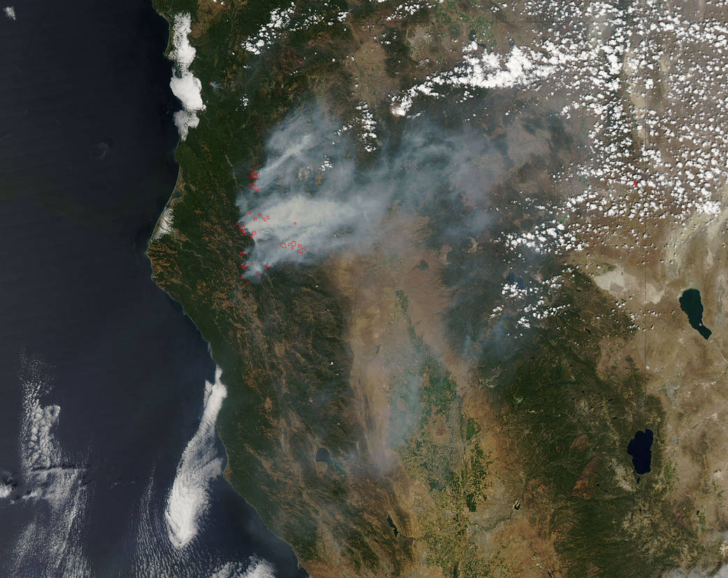 The fires that have been plaguing California are still not releasing their grip on the state. A more intensive feature regarding these fires can be found in the August 04 update. This natural-color satellite image was collected by the Moderate Resolution Imaging Spectroradiometer (MODIS) aboard the Aqua satellite on August 05, 2015. Actively burning areas, detected by MODIS’s thermal bands, are outlined in red. Smoke is grey and appears to be moving east.