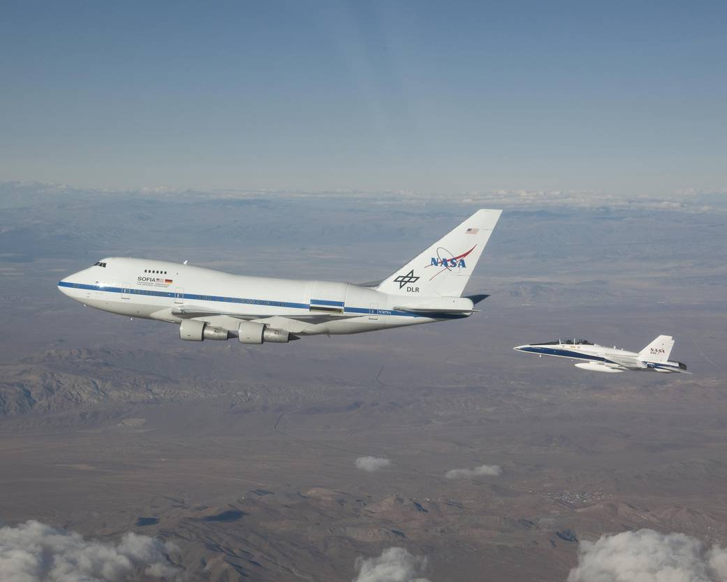 A NASA F/A-18 trails NASA’s SOFIA 747SP during a test of the flying observatory’s telescope cavity door opening mechanism. Test engineers opened the telescope cavity door to 10 percent of its maximum range, exposing the telescope to the airstream for the first time.December 14, 2009