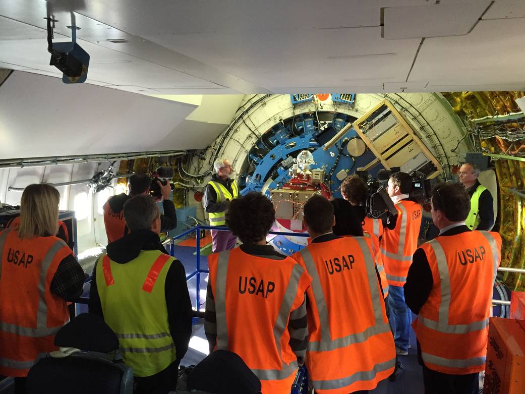 Representatives of New Zealand media onboard SOFIA during a tour, hearing NASA SOFIA Mission Manager Ed Harmon (back, left) and DLR SOFIA Project Engineer Heinz Hammes (back, right) explain the FORCAST instrument and the telescope instrument mount. ‘USAP’ on the red safety vests stands for U.S. Antarctic Program. (NASA/SOFIA/USRA/ASP/N. Veronico)